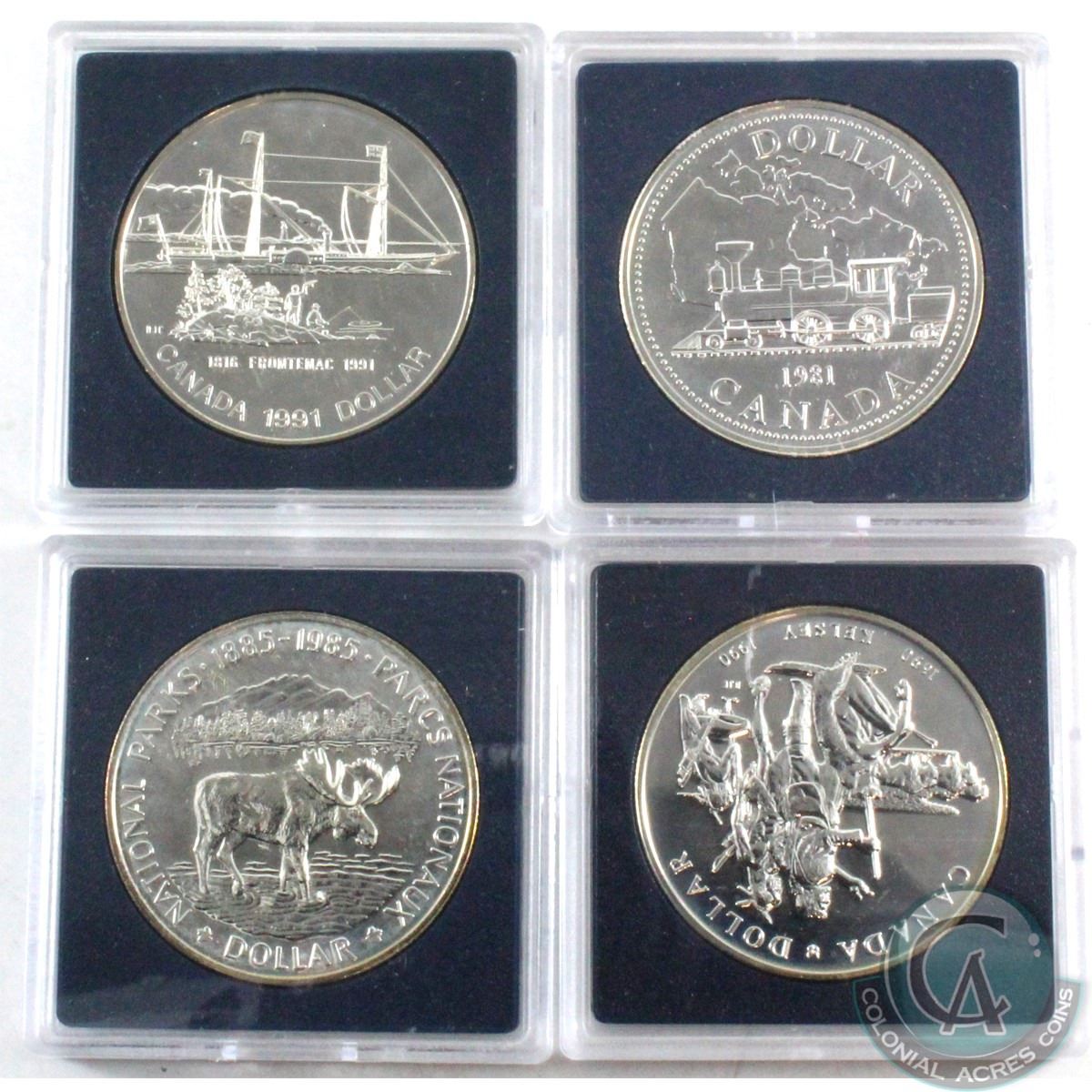 RCM Lot: 1981-1991 Canada Commemorative Brilliant Uncirculated Silver Dollars. The dates you will receive are: 1981, 1985, 1990 and 1991. Each coin is encapsulated in a square capsule (lightly toned). (4pcs)