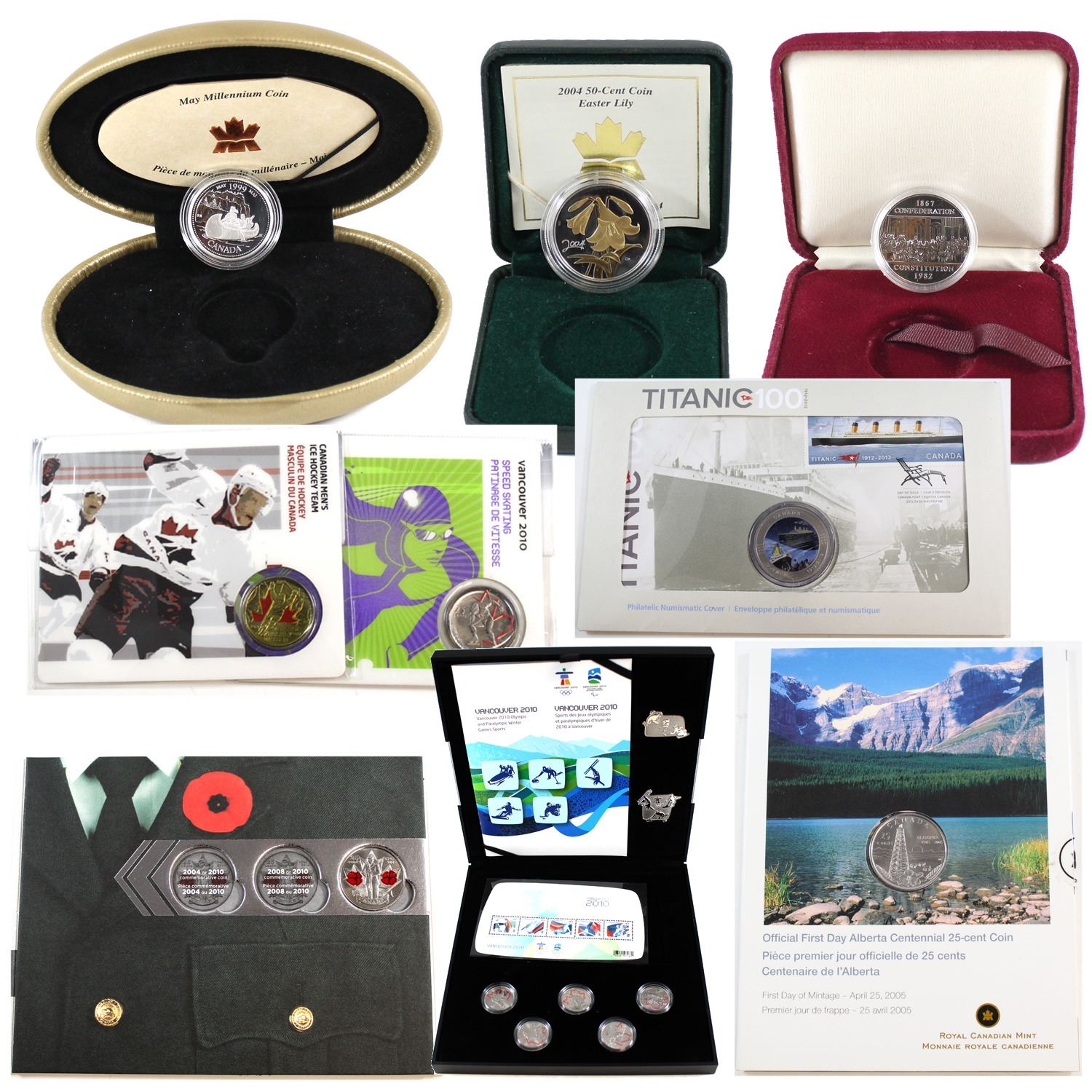 RCM Lot: 1982 Constitution Dollar, 1999 May Proof Millennium 25-cent, 2004 Easter Lily 50-cent (missing outer sleeve), 2005 Alberta First Day Cover, 2009 Petro Canada Men's Hockey 25-cent, 2009 Petro Canada Speed Skating 25-cent, 2012 Canada Post Titanic 25-cent First Day Cover Coin and Stamp Set, 2010 Remembrance Day Collector card with 2010 Poppy 25-cent & 2010 Vancouver Olympic Silver Collector set (missing outer sleeve). 9 pcs