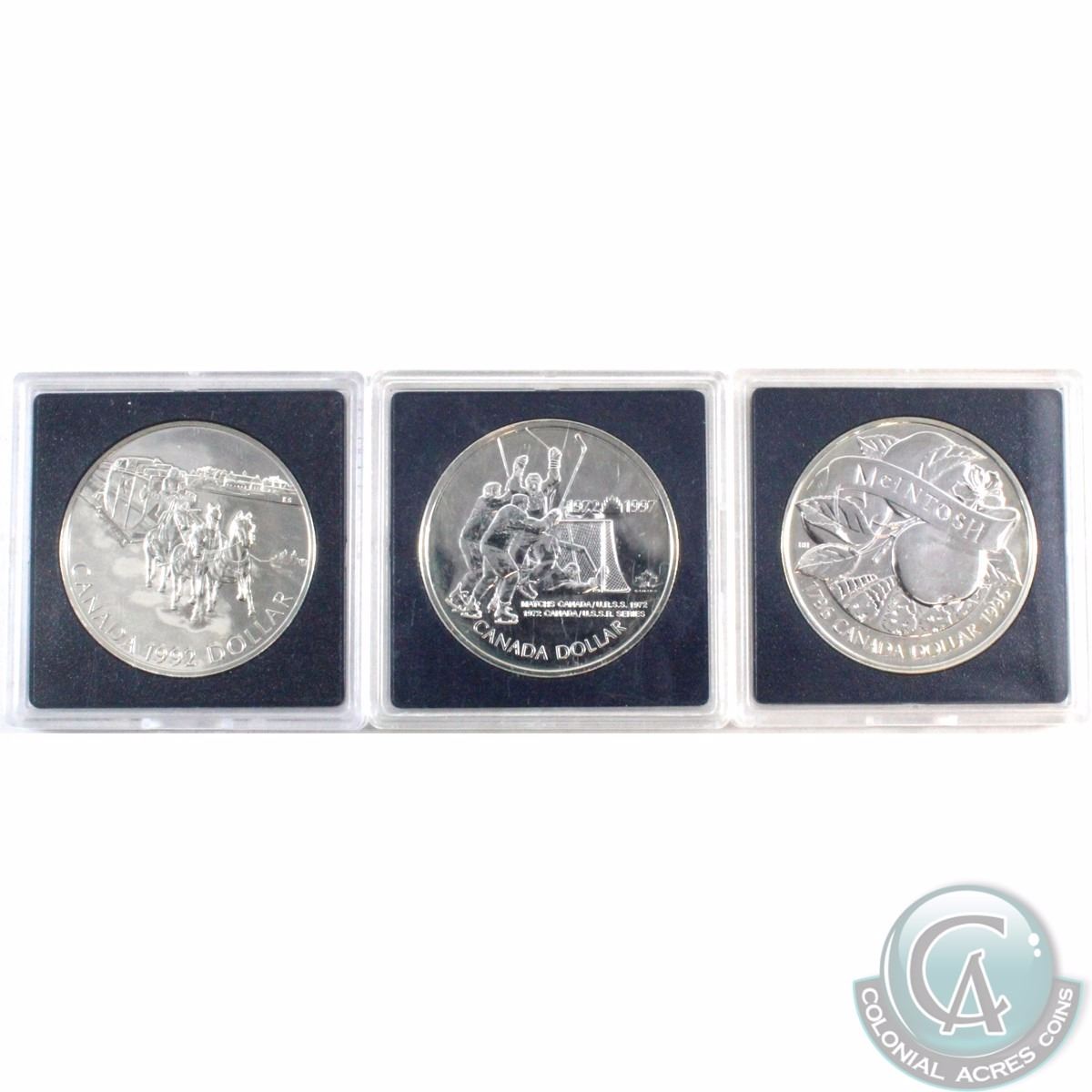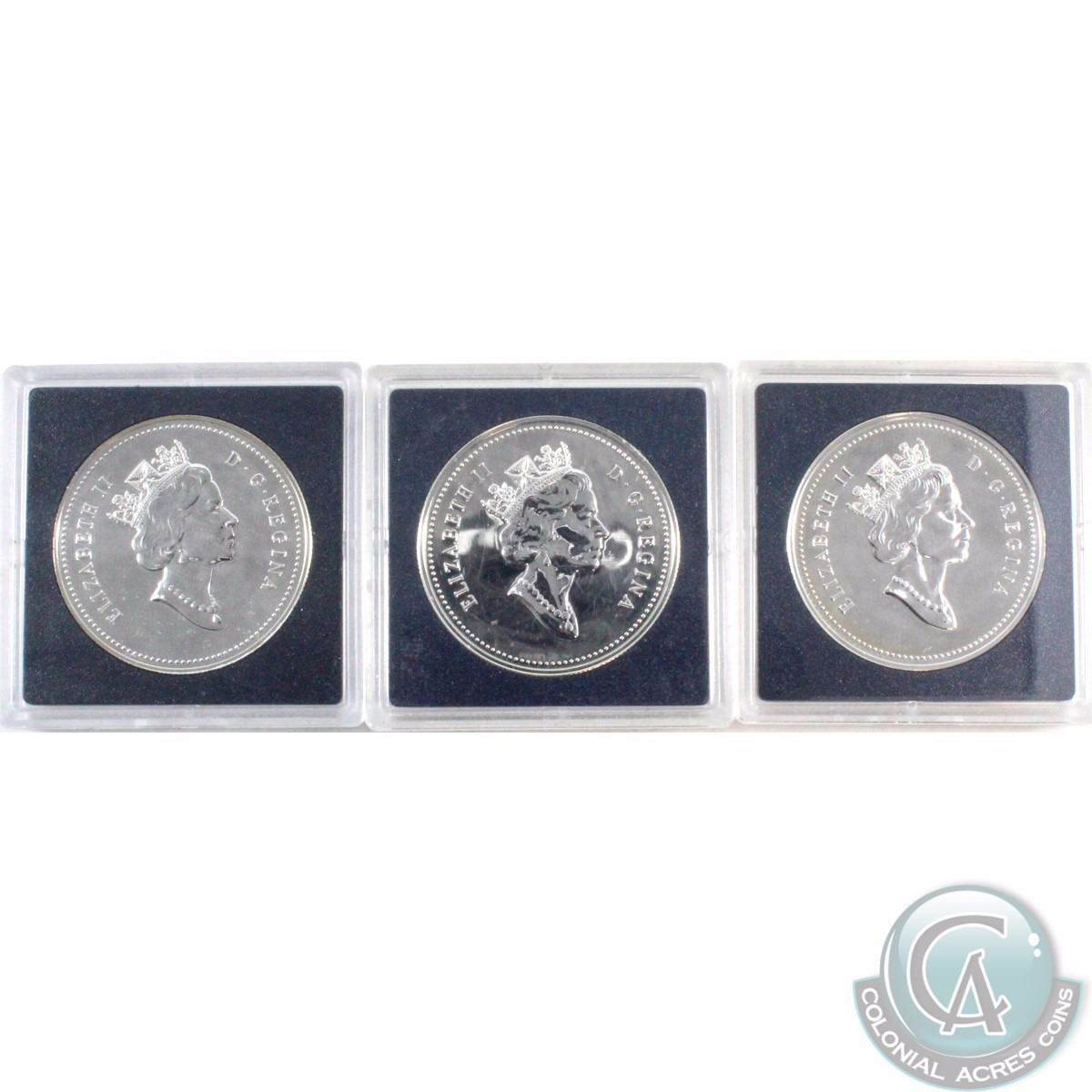 RCM Lot: 1992-1997 Brilliant Uncirculated Silver Dollars. The dates you will receive are: 1992, 1996 and 1997. Please Note that all coins are lightly toned and capsules are lightly scratched (3pcs)