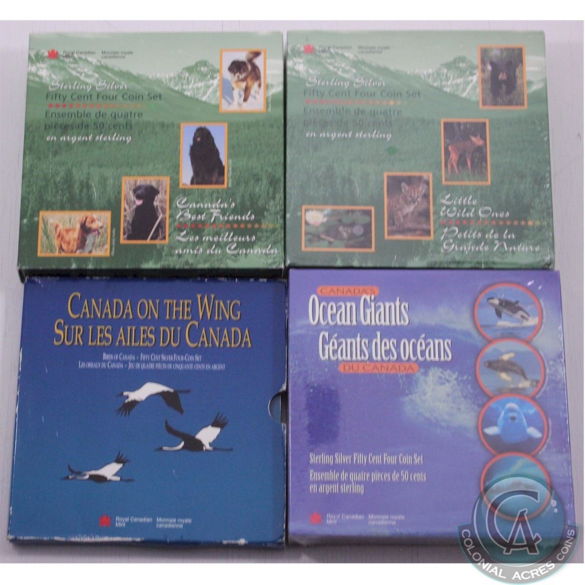 RCM Lot: 1995, 1996, 1997 and 1998 Canada 50-cent Discover Nature 4-coin sets. This lot includes the 1995 Birds of Canada 4-coin 50-cent set, 1996 Little Wild Ones 4-coin set, 1997 Dogs of Canada 4-coin set, and the 1998 Ocean Giants 4-coin set (some coins lightly toned). Comes with all original Mint packaging. (4pcs)