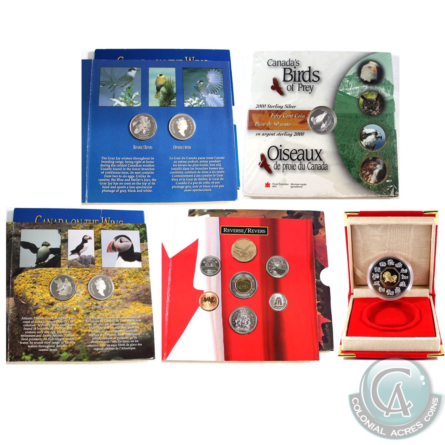RCM Lot: 1995 Birds of Canada 4-coin 50-cents set (missing outer sleeve), 1997 oh Canada set, 2000 Birds of prey sterling silver 50-cent-Pandion haliaetus & 2002 Year of the Horse $15 sterling silver coin ( capsule is scuff, missing COA and outer box).