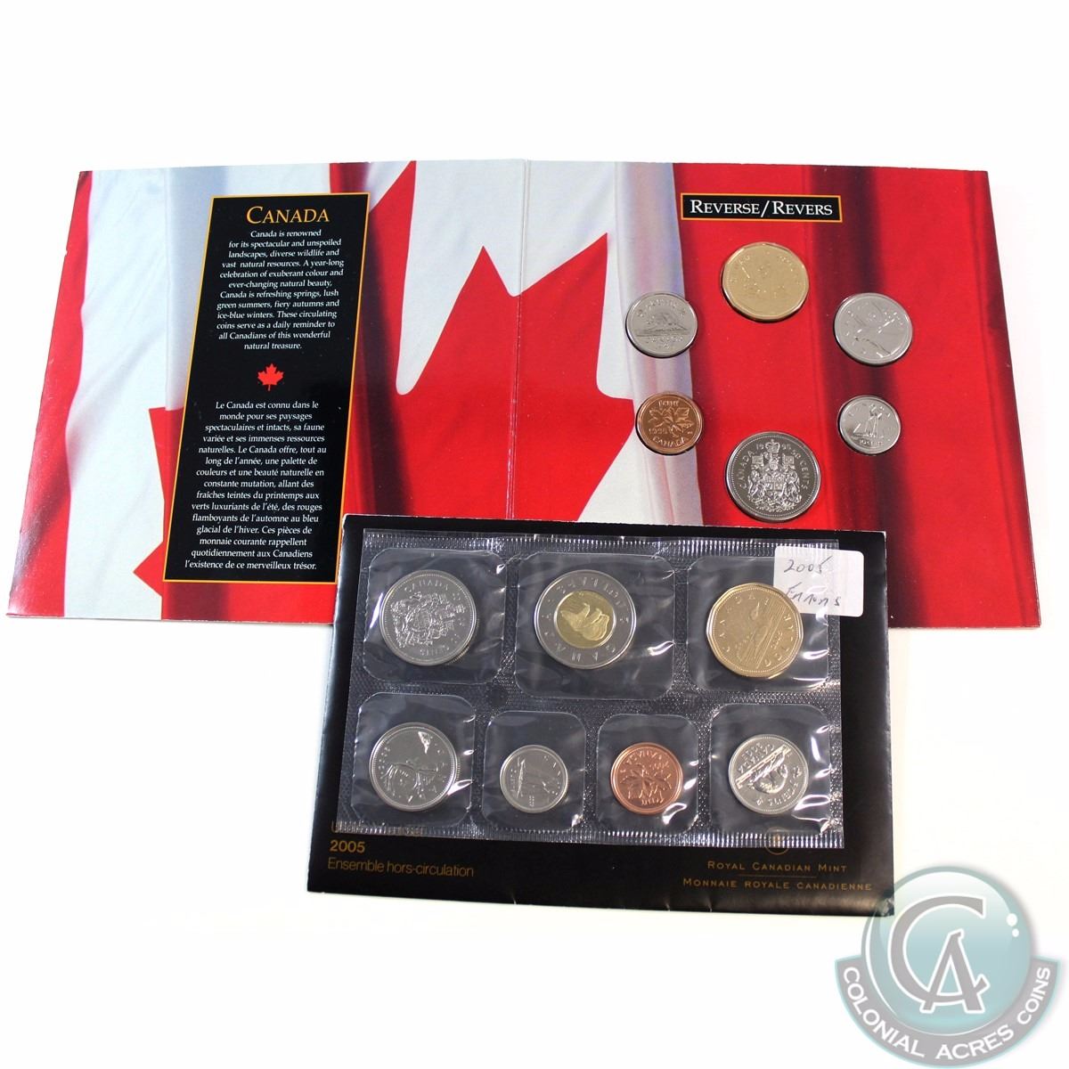RCM Lot: 1995 Oh Canada Uncirculated Set & 2005 Proof Like Set with $2 stamped off-center and 50-cent piece has a dimple on the face of the coin. 2 sets