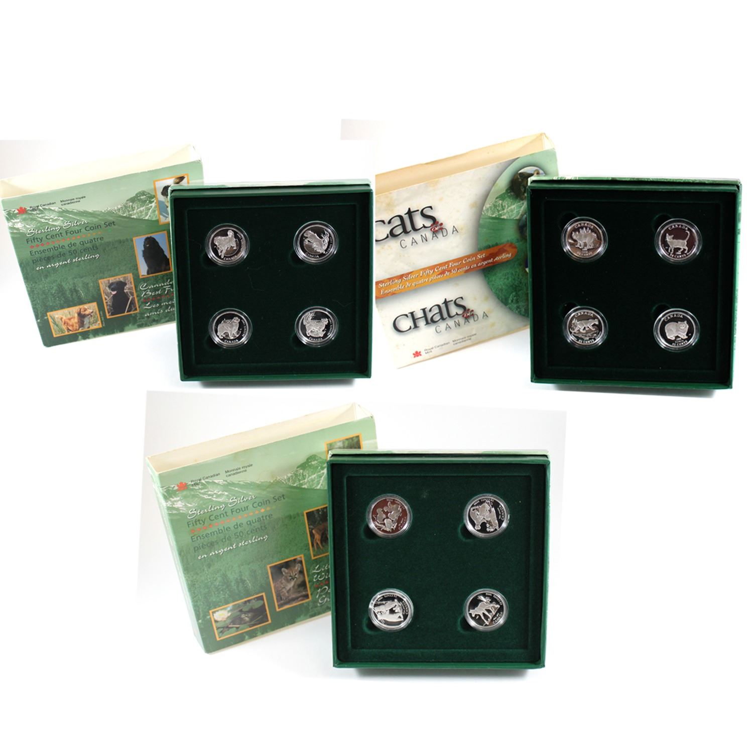 RCM Lot: 1996-1999 Canada 4-Coin Animal Sterling Silver Proof 50-cent Sets. You will receive 1996 Little Wild Ones, 1997 Canada's Best Friends Dogs & 1999 Cats of Canada Sterling Silver 4-coin sets. Coins comes with original Mint packaging (outer sleeves contain various imperfections, one capsule is cracked and coins contain light toning). 3pcs