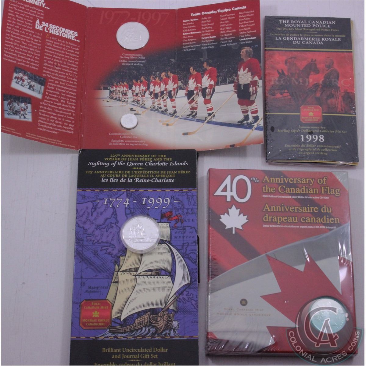 RCM Lot: 1997, 1998, 1999 and 2005 Brilliant Uncirculated Silver Dollar sets. This lot includes the: 1997 Brilliant Uncirculated Dollar & Pin set, 1998 Brilliant Uncirculated Dollar & Pin set, 1999 Brilliant Uncirculated Dollar & Journal gift set, and the 2005 Brilliant Uncirculated Dollar and Interactive CD-Rom.