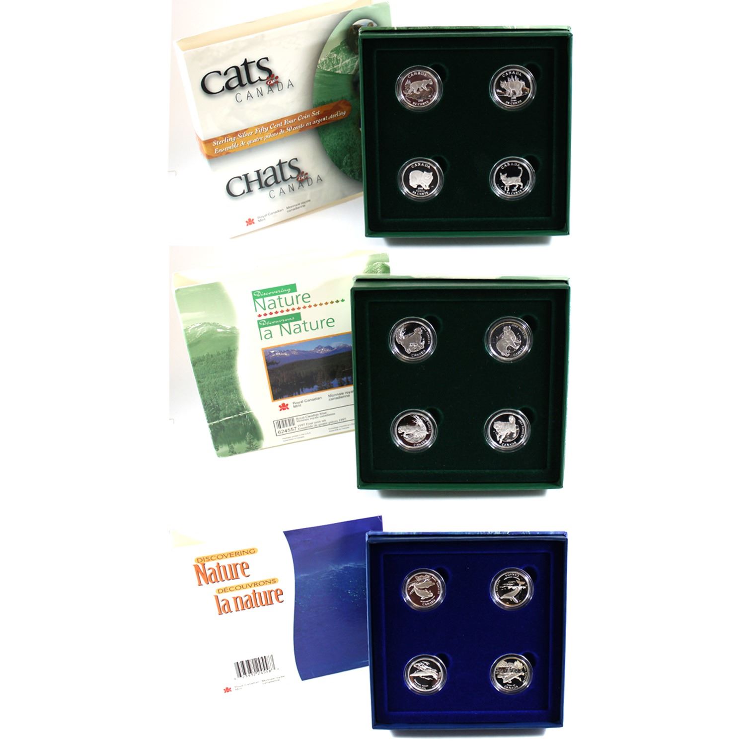 RCM Lot: 1997-1999 Canada 4-Coin Animal Sterling Silver Proof 50-cent Sets. You will receive 1997 Canada's Best Friends Dogs, 1998 Ocean Giants & 1999 Cats of Canada Sterling Silver 50-cent 4-coin set. Comes with original Mint packaging (coins are lightly toned). 3 sets