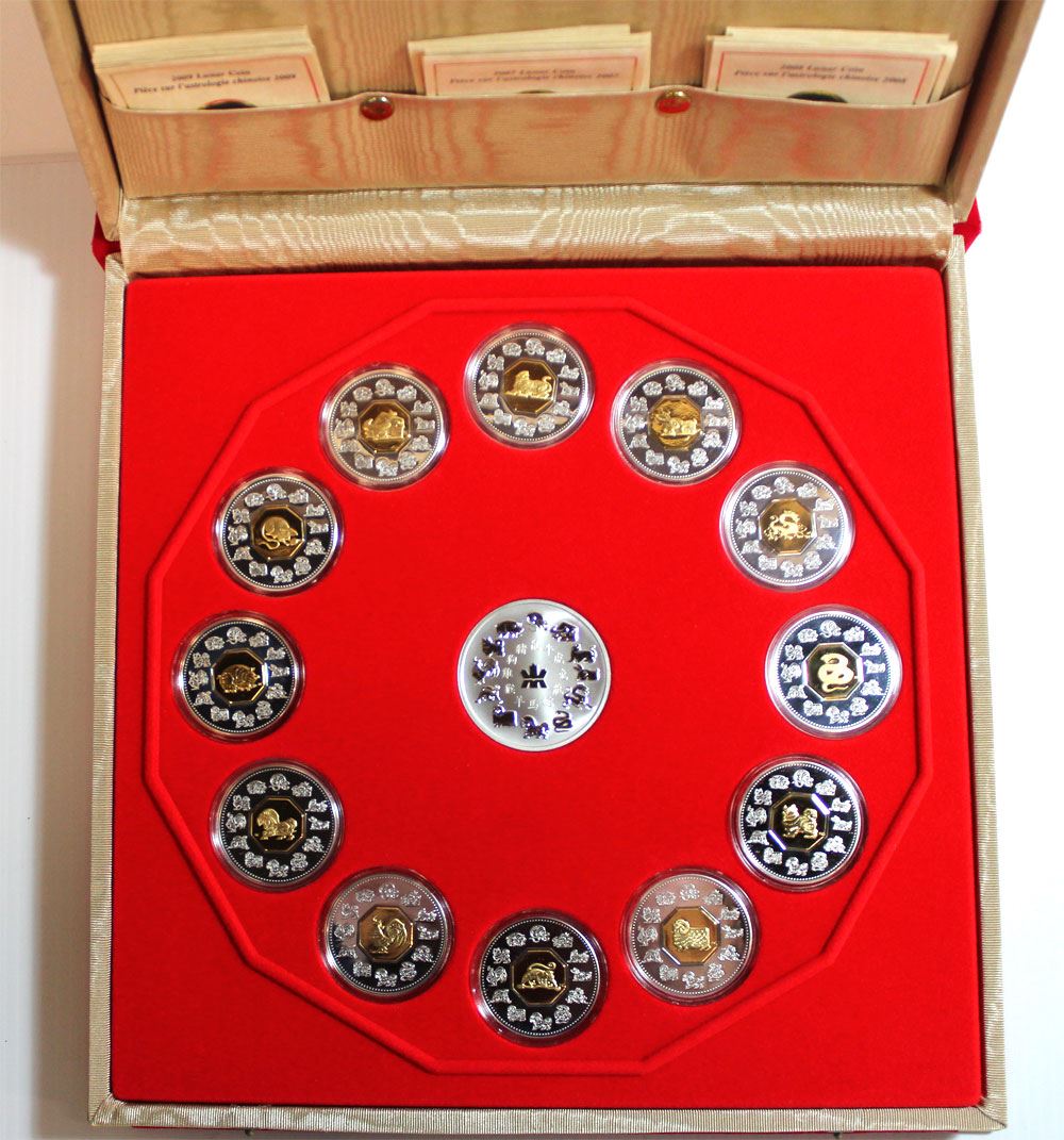 RCM Lot; 1998-2009 Full 12-coin $15 Lunar Silver/Gold Coin Set with special Silver Medallion in Deluxe RCM Box. Lot of 12 coins plus silver medallion.