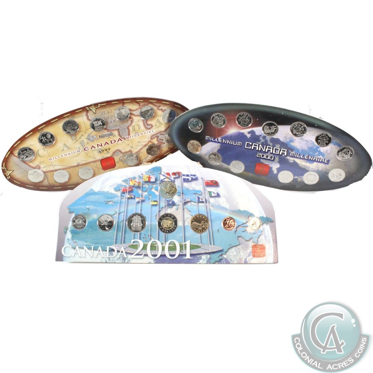 RCM Lot: 1999 NESTLE, 2000 and 2001 Official RCM Commemorative Oval Shaped display holder with coins and token. Some coins are lightly toned in these sets. (3 sets)
