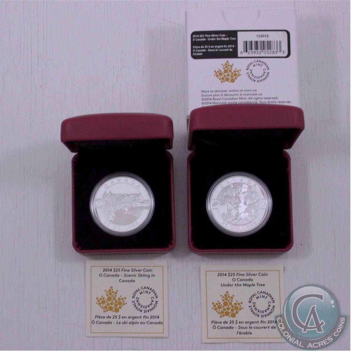 RCM Lot: 2 x 2014 $25 O Canada Series Fine Silver Coins. Included are 2014 $25 Under the Maple Tree and 2014 $25 Scenic Skiing in Canada. Both coins comes encapsulated with display box and Certificate (2pcs)