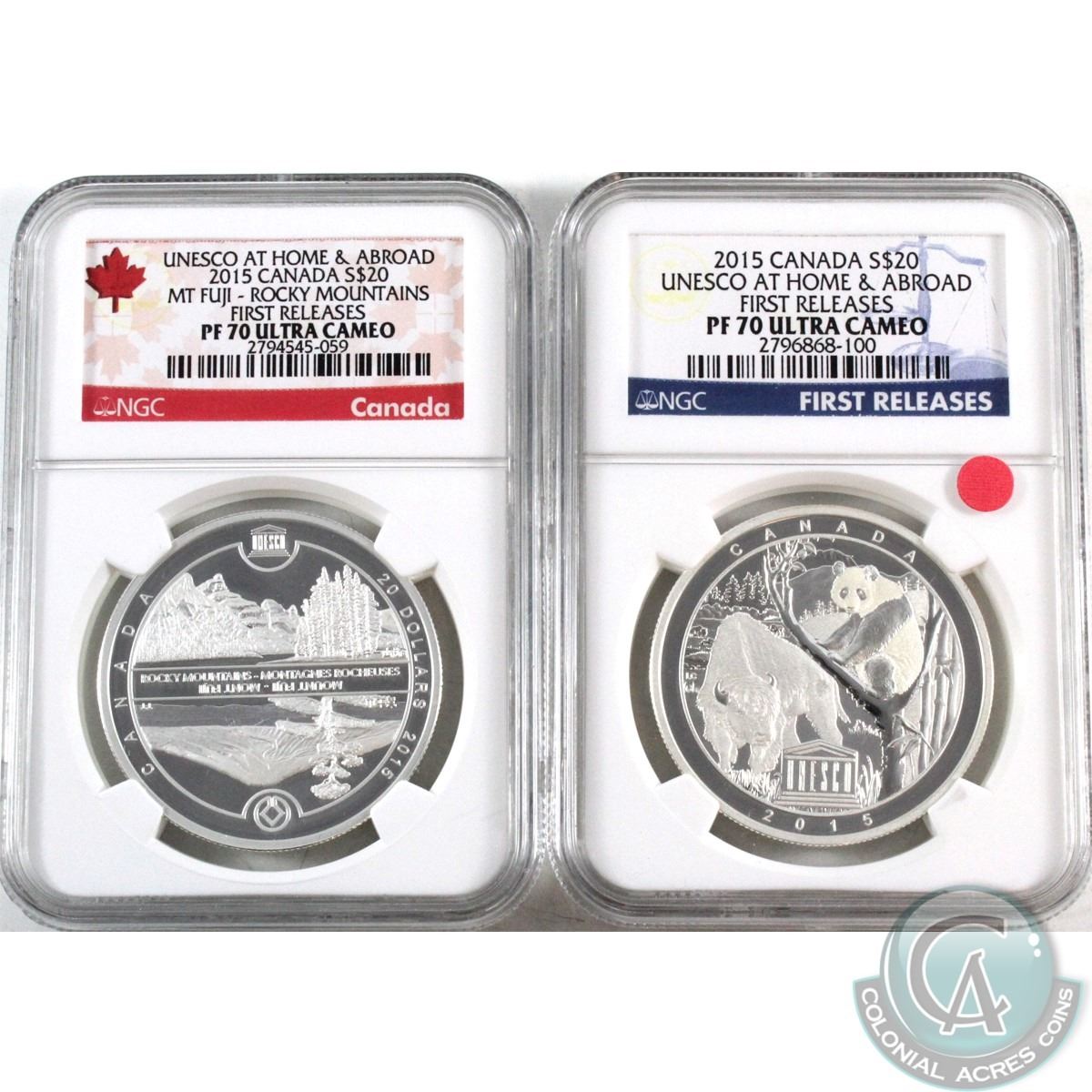 RCM Lot: 2 x 2015 Canada UNESCO Home & Abroad $20 NGC Certified Fine Silver Coins. You will receive 2015 Mt Fuji- Rocky Mountains FIRST RELEASES NGC PF-70 (POPULATION: 7!!) & 2015 Wood Buffalo National Park and Sichuan Giant Panda Sanctuaries FIRST RELEASES NGC Certified PF-67 (TAX Exempt) - 2pcs