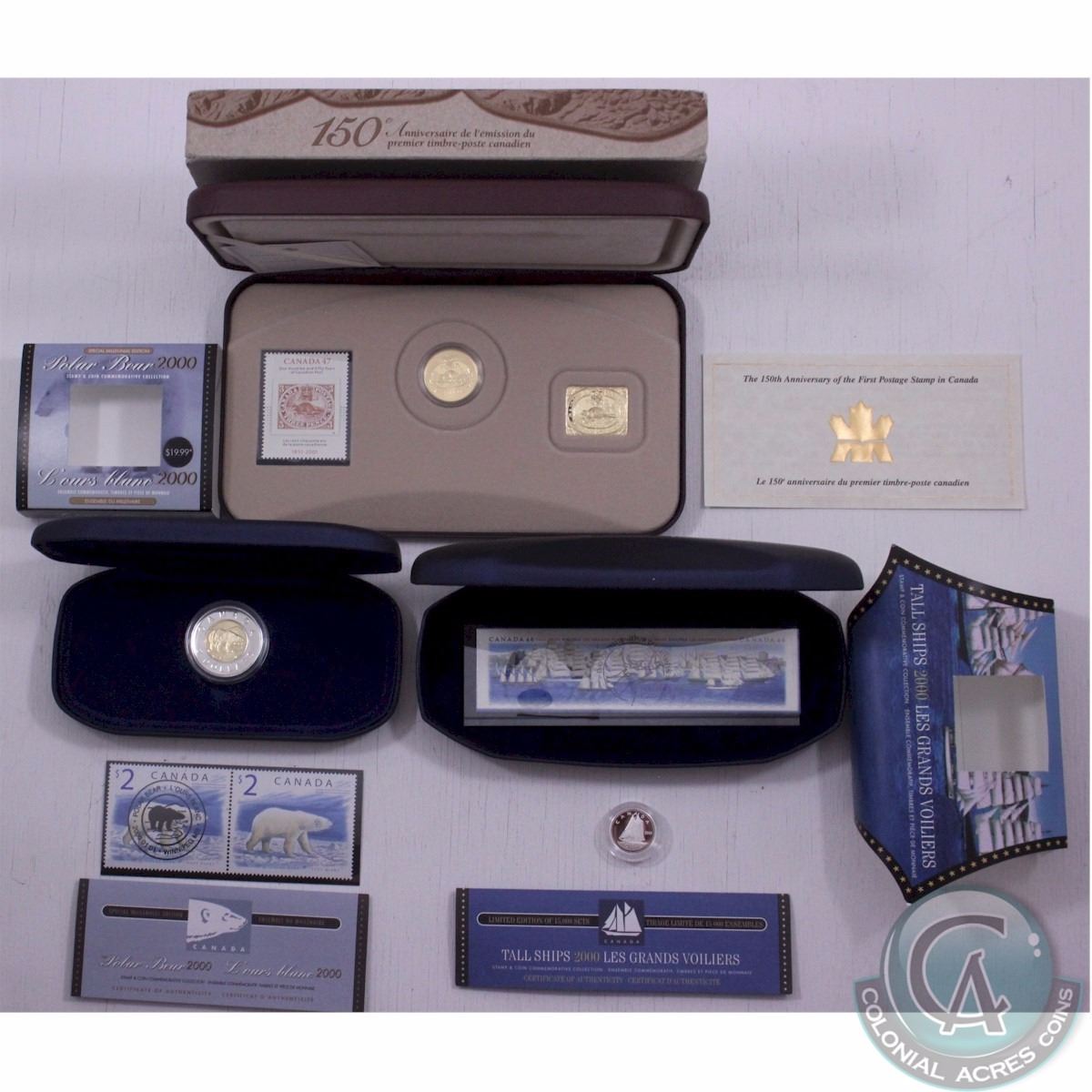 RCM Lot: 2000-2001 Canada Commemorative Coin and Stamp Sets. The sets that are included in this group lot are the: 2000 $2 Special Millennium Edition Polar Bear Set, 2000 10-cent Tall Ships Set and the 2001 3-cent 150th Anniversary of the First Postage Stamp in Canada Set (3pcs)