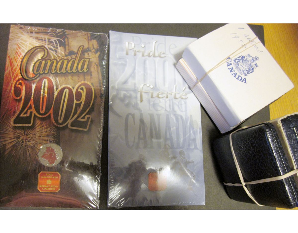 RCM Lot; 2000 Pride & 2002 Canada Day Coloured 25 Cents in original unopened package. Specimen Nickel Dollar in Blue Case from the Mint year 1972 Voyageur x 2 and 1973 P.E.I. Centennial x 2. Lot of 6 sets.