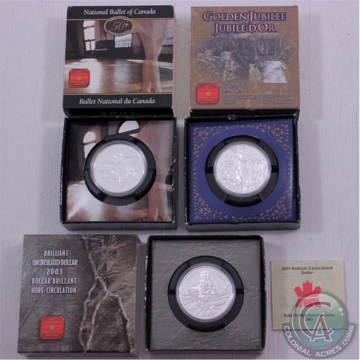 RCM Lot: 2001-2003 Canadian Commemorative Brilliant Uncirculated Silver Dollars. This lot includes the 2001 Ballet, 2002 Golden Jubilee and the 2003 100th Cobalt Strike. These coins come with all original packaging from the mint (2002 outer cardboard sleeve has sticker residue). 3pcs (TAX Exempt)