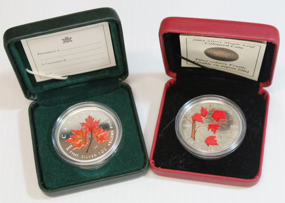 RCM Lot; 2001 Red & 2004 Coloured $5 Silver Maple Leafs - 2pcs. No Tax