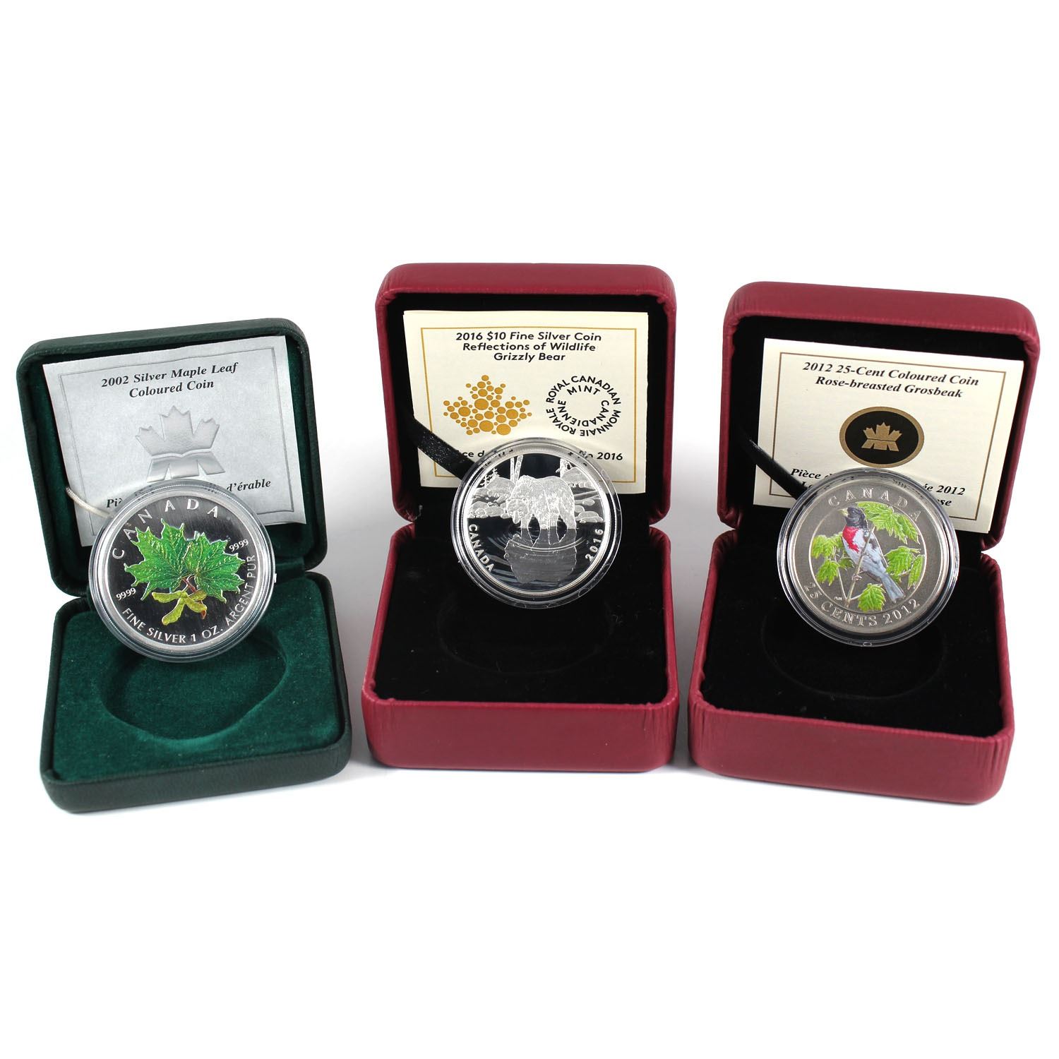 RCM Lot - 2002 $5 Coloured Silver Maple Leaf, 2012 25-cent Rose-Breasted Grosbeak & 2016 $10 Reflections of Wildlife - Grizzly Bear (2002 has a few light toning spots & coins are missing outer sleeves). 3pcs (TAX Exempt)