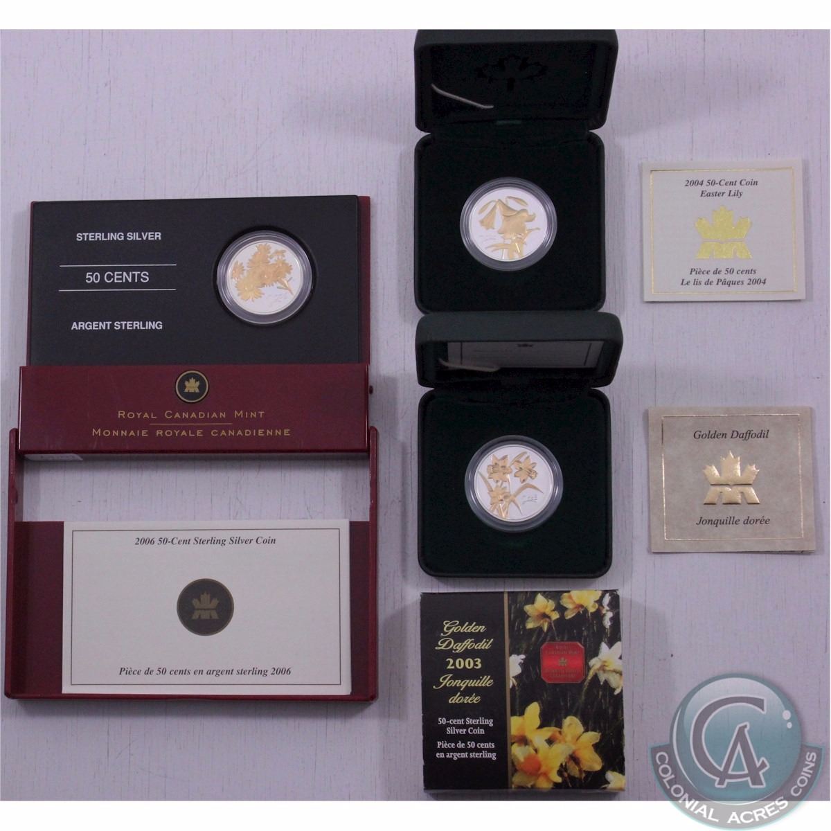 RCM Lot: 2003 Canada 50-cent Golden Daffodil, 2004 Easter Lily 50-cent and the 2006 50-cent Golden Daisy Sterling Silver Coins. Each Coin comes encapsulated with Certificate and display box. 3pcs