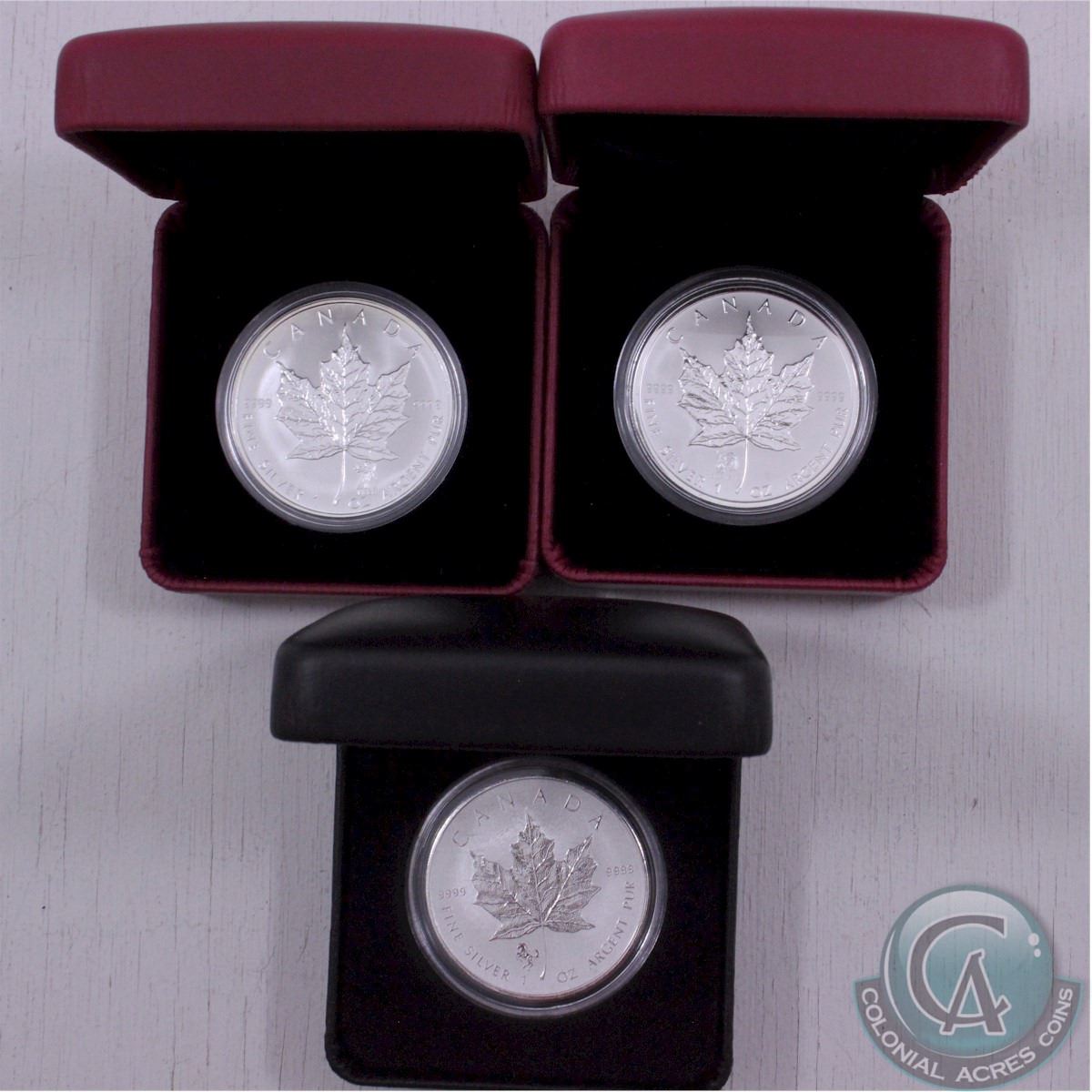 RCM Lot: 2004-2014 Canada $5 Commemorative 1oz Privy Mark Silver Maple Leafs issued by the RCM. You will receive the 2004 Virgo, 2005 Rooster and the 2014 Horse Privy Silver Coins. These coins come encapsulated in a clamshell display case. 3pcs (TAX Exempt)