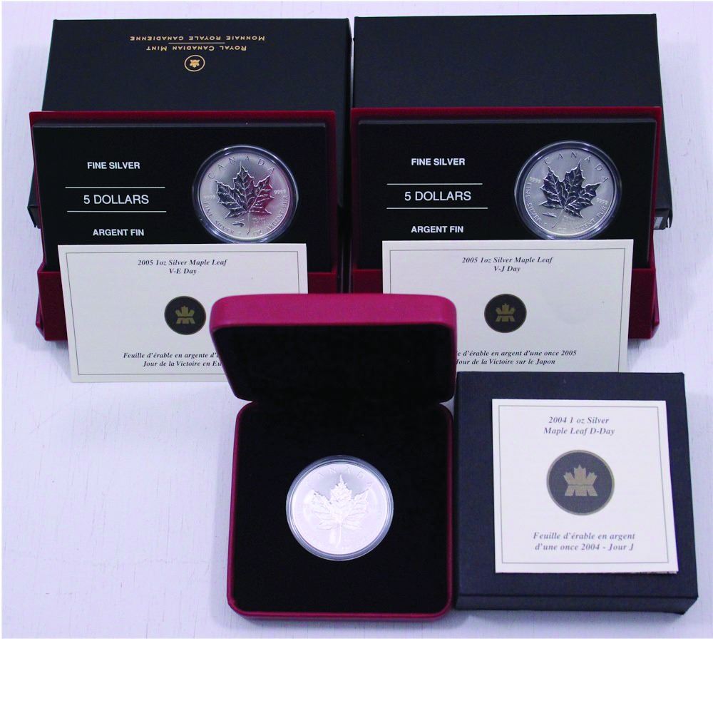 RCM Lot 2004 D-day, 2005 VJ Day & 2005 VE Day 1oz .9999 Fine Silver $5 Commemorative Maple leaf Coins with all original Mint packaging. (Tax Exempt)
