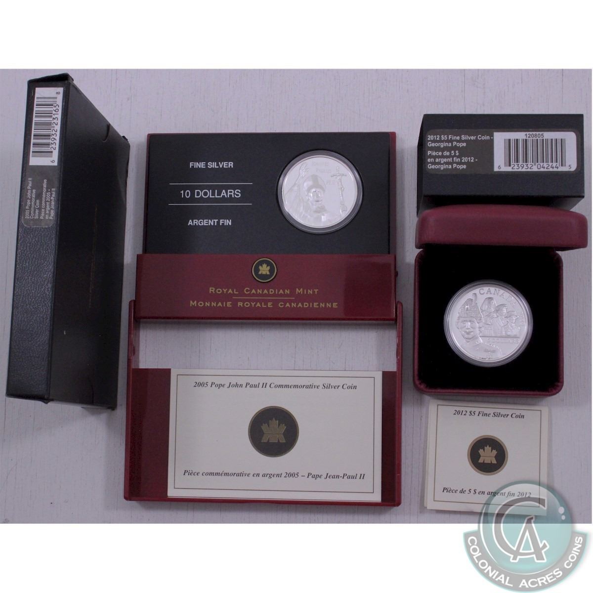 RCM Lot: 2005 Canada $10 Pope John Paul II & 2012 Canada $5 Georgia Pope Fine Silver Coins (TAX Exempt) Coin comes in original Mint packaging with COA (Outer sleeve of the 2005 Pope is dented) (2pcs)