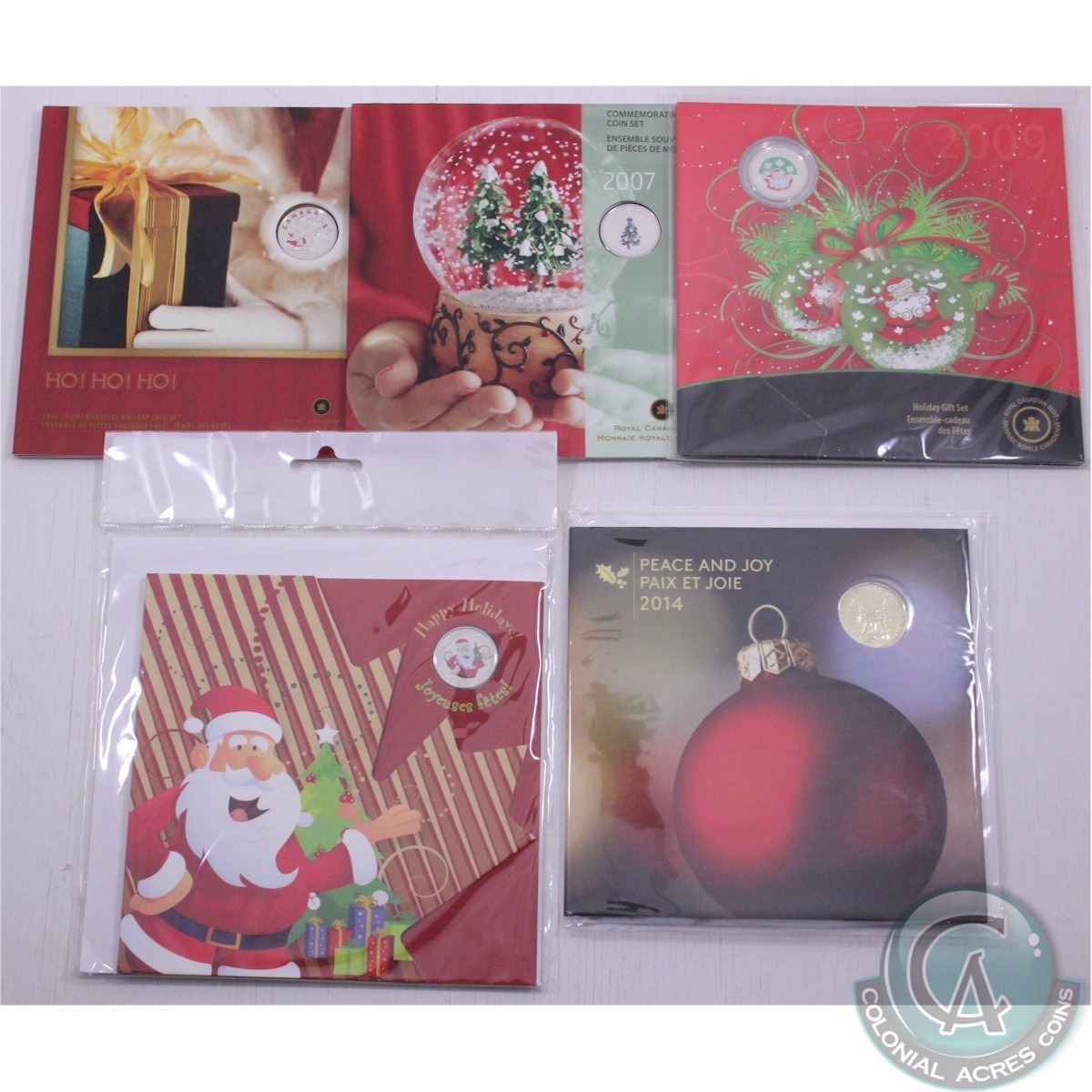 RCM Lot: 2006 -2009 Canada Commemorative Holiday Gift Sets. You will receive the 2006, 2007, 2009, 2010 and 2014 Gift Sets. Each set features a colourized quarter of a Holiday Theme, except for the 2014 which features a non-coloured Commemorative Loonie. (5pcs)