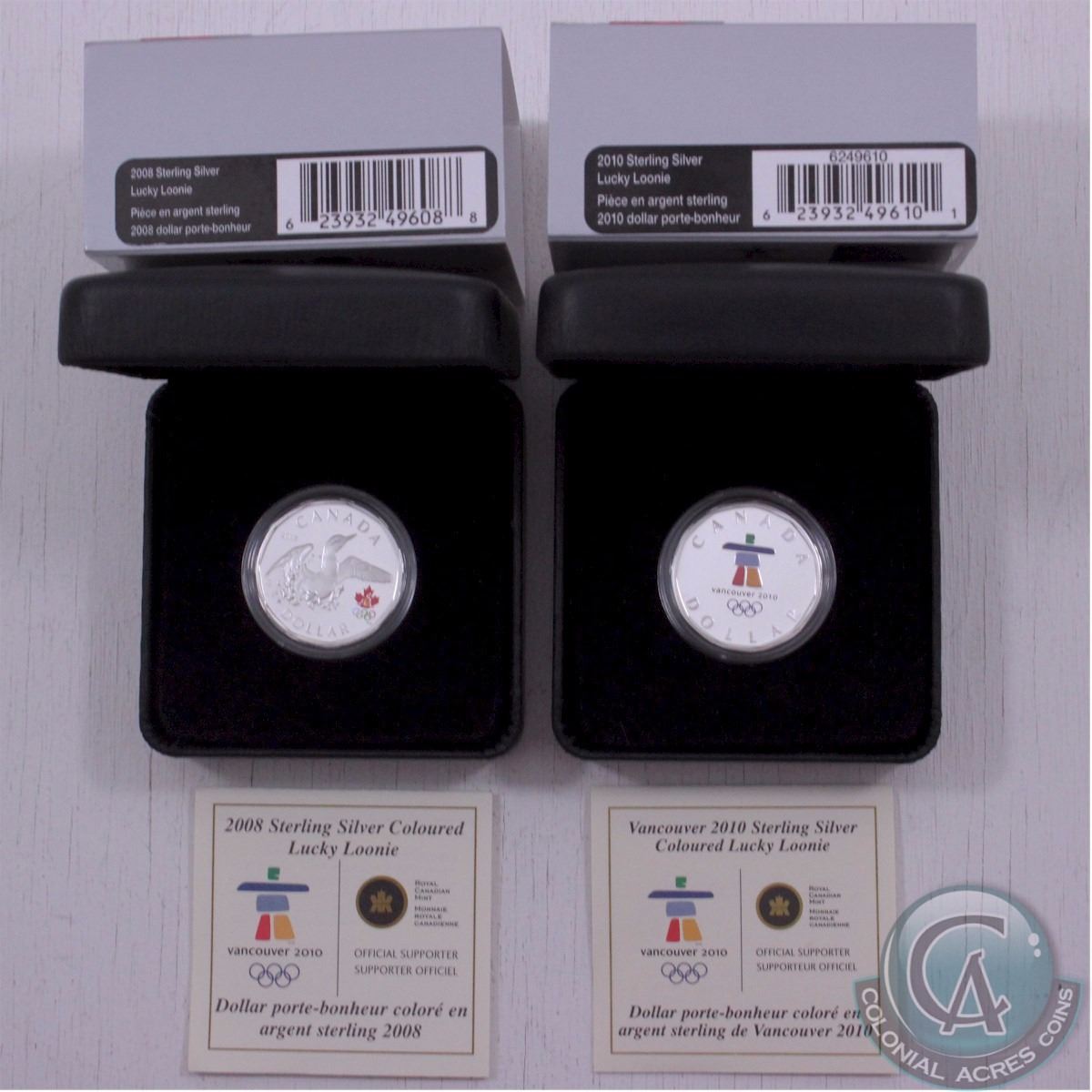 RCM Lot: 2008-2010 Canada $1 Sterling Silver Coloured Lucky Loonies Commemorating the Vancouver 2010 Olympics. You will receive the 2008 Coloured Olympic Lucky Loonie and the 2010 Coloured Inukshuk Lucky Loonie. Both coins come with the original packaging from the Royal Canadian Mint (2pcs)