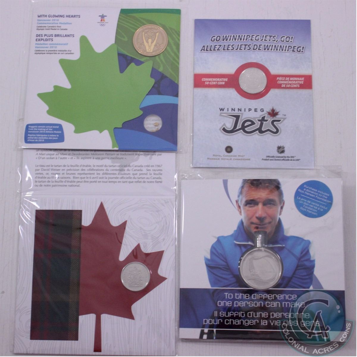 RCM Lot: 2010-2013 Commemorative 50-cent and Medallion Sets. Included are: 2011 50-cent Winnipeg Jets, 2011 Rick Hansen 25th Anniversary Relay Medallion, 2010 "With Glowing Hearts" First Olympic Gold Commemorative Medallion and Nuggets, and 2013 The Maple Leaf Tartan 50-cent Coin and Tartan Swatch (4pcs)