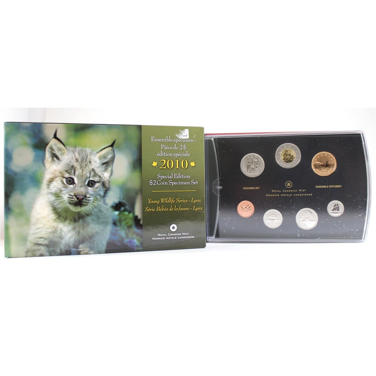 RCM Lot 2010 Mule Specimen Set! This set features the Commemorative Lynx $2 coin. The Mule is on the 10-cent coin that has been struck with a Specimen finish in Reverse and an Proof-Like Finish on the Obverse. Set comes in all original packaging.