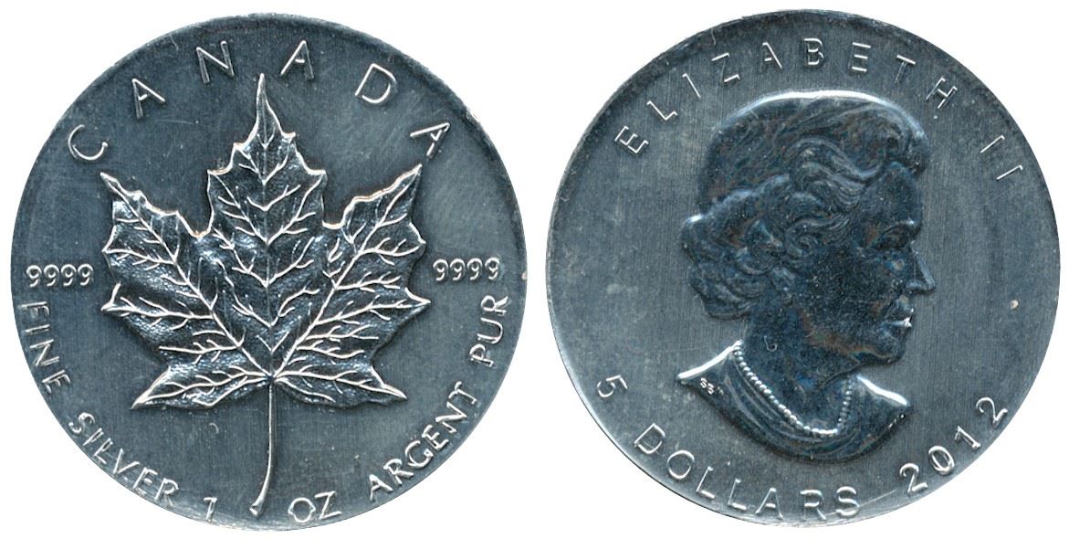 RCM Lot; 2012 $5 SML Error CCCS MS65. Struck on Commemrative silver dollar planchet. Weighs 23,2gr. First ever handled by us.