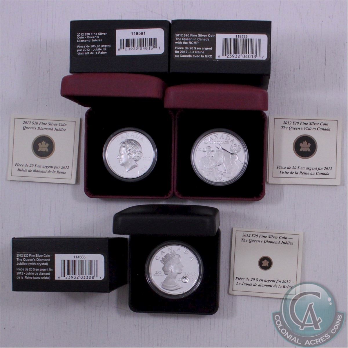 RCM Lot: 2012 Canada $20 Queen's Diamond Jubilee Fine Silver Coins (TAX Exempt). This Lot includes the 2012 Diamond Jubilee with Crystal (outer box slightly bent), 2012 Queen's Visit to Canada (outer box slightly bent) and the 2012 High Relief Queen's Diamond Jubilee coin. (3pcs)