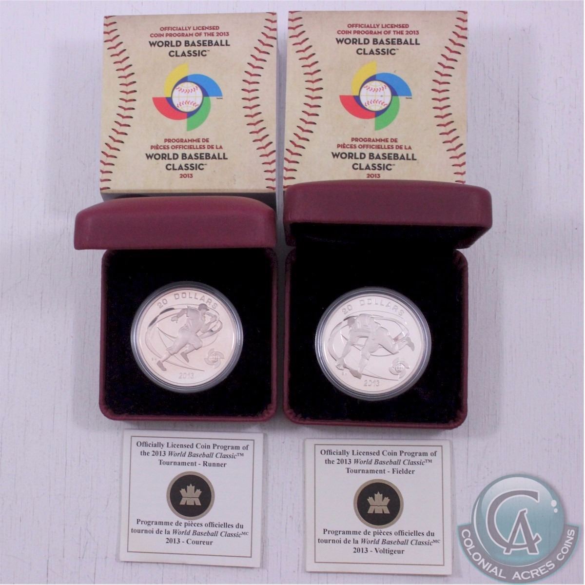 RCM Lot: 2013 Canada $20 Runner & Fielder World Baseball Classics Tournament Series 1oz Fine Silver Coins (TAX Exempt). Each Coin comes with all original mint packaging (lightly toned) 2pcs