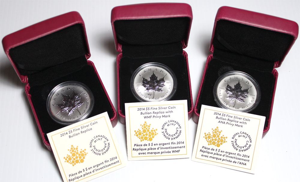 RCM Lot; 2014 $5 Bullion Replica with Privy, 2014 $5 American Numismatic Association Maple Leaf and 2014 $5 Bullion Replica Fine Silver Coins. Lot of 3 coins No Tax