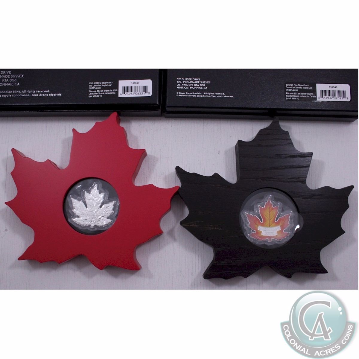 RCM Lot:2015 $20 Fine Silver Canadian Maple Leaf Shaped coin & 2016 Fine Silver $20 Colorful Canadian Maple Leaf Shaped Fine Silver Coins (Tax Exempt)