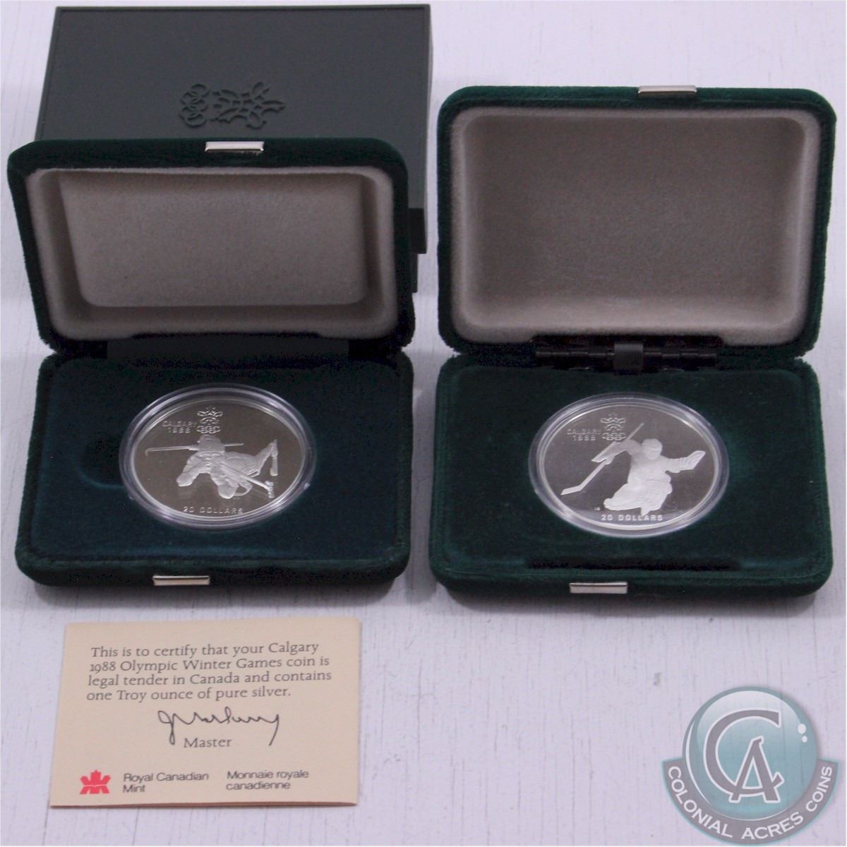 RCM Lot: 2x 1986 $20 Calgary Olympics Proof Sterling Silver Coins Commemorating the 1988 Calgary Olympics. This lot includes the 1986 Hockey Goalie (toned) and the 1986 Biathlon coins. Each coin contains 1 troy ounce of Silver (Total coin weight 34.107 grams). Both coins come encapsulated in a green display case. (2pcs)