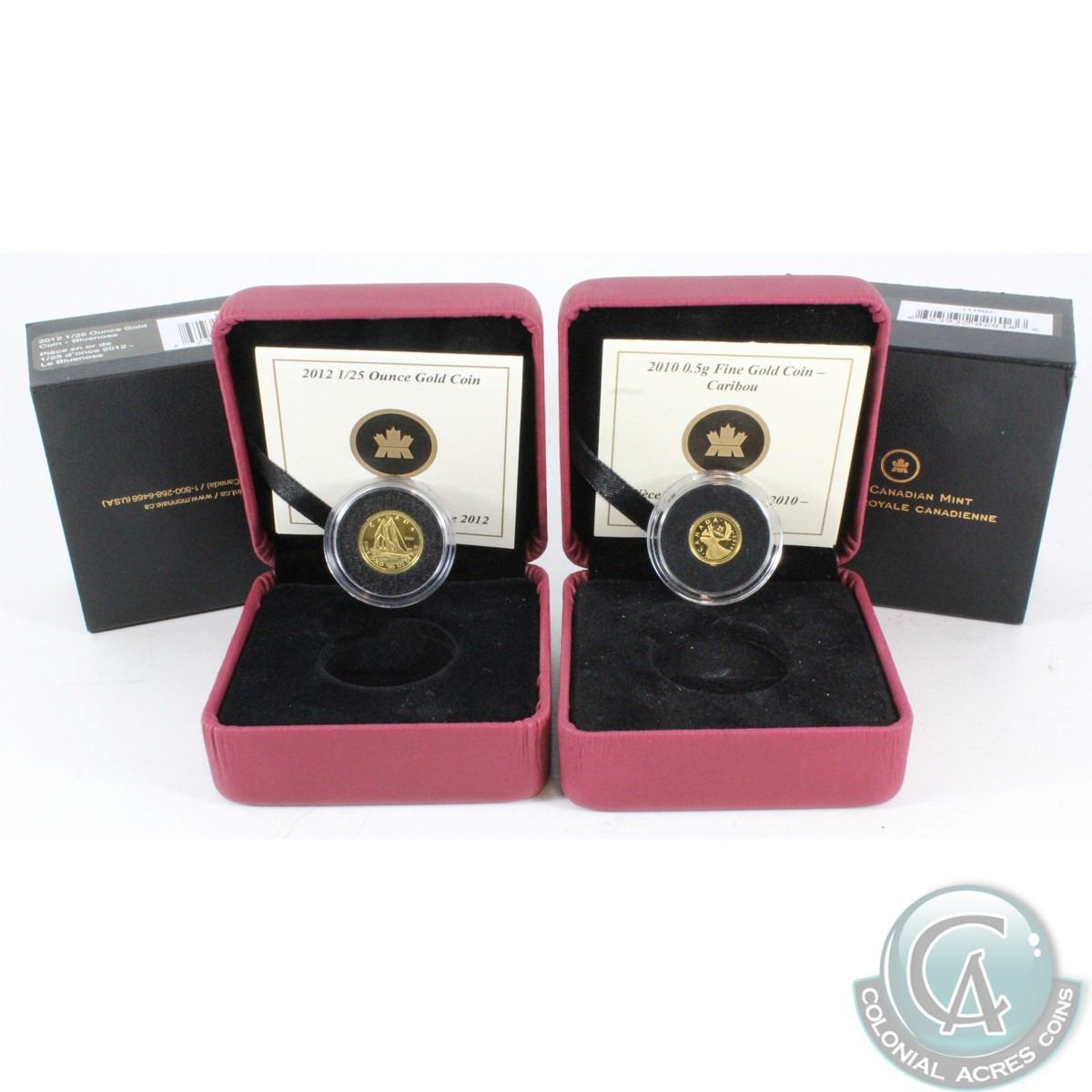 RCM Lot: 2x 2010 25-cent 0.5 gram Pure Gold Caribou and the 2012 50-cent 1/25th ounce Pure Gold Bluenose Coins (TAX Exempt). (2pcs)