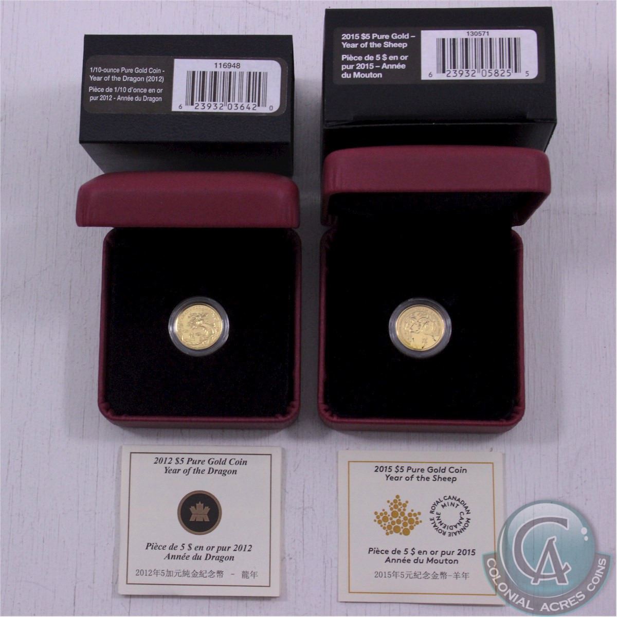 RCM Lot: 2x 2012 & 2015 Canada 1/10 $5 Pure Gold Coins. You will receive the 2012 Year of the Dragon & 2015 Year of the Sheep (TAX Exempt). 2pcs