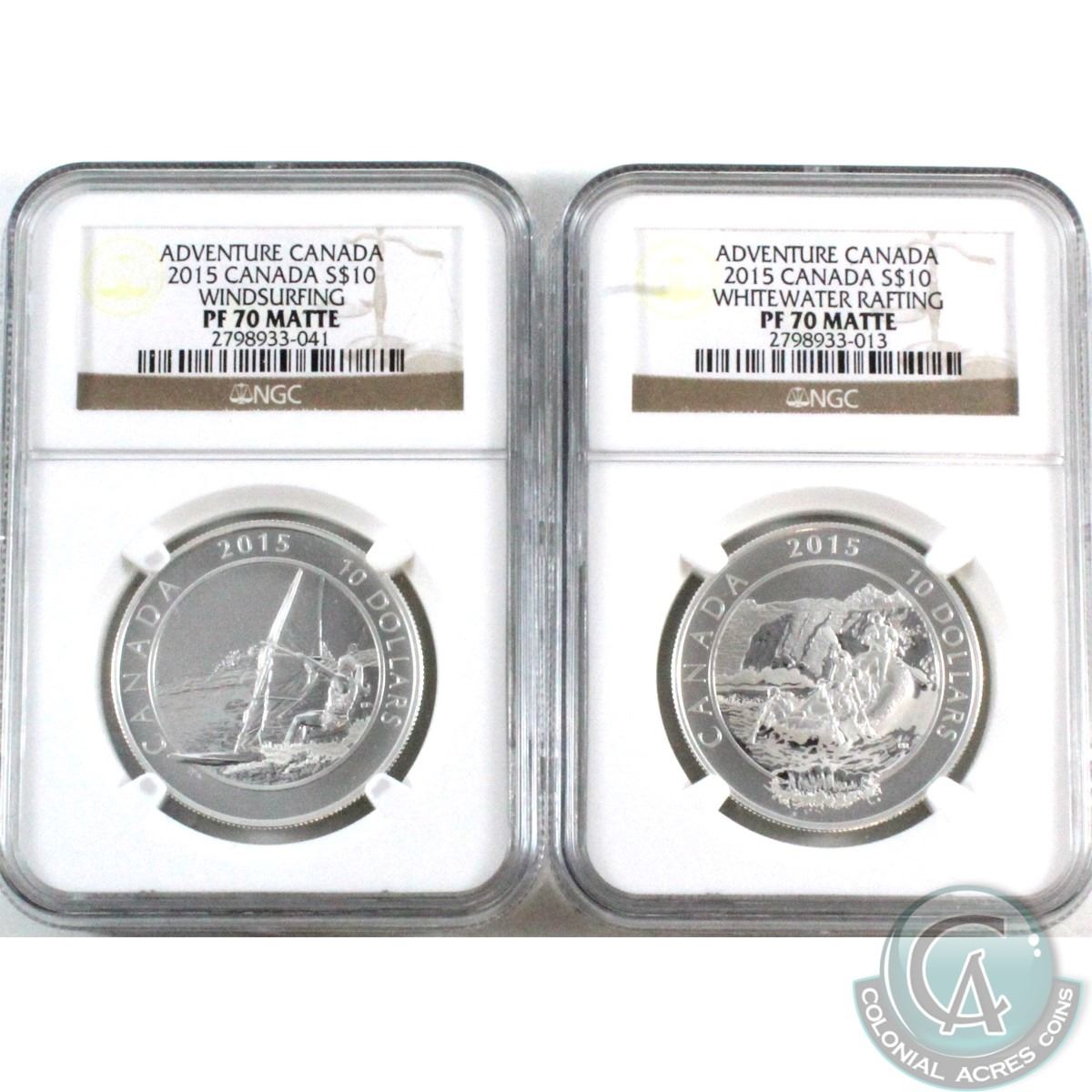 RCM Lot: 2x 2015 Canada $10 Adventure Canada Series Fine Silver Coins NGC Certified PF-70 Matte. This lot includes the 2015 Canada $10 Windsurfing and the 2015 Canada $10 White-Water Rafting (TAX Exempt) (2pcs)