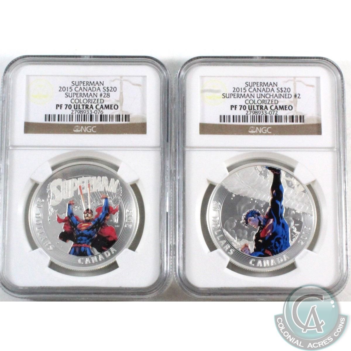 RCM Lot: 2x 2015 Canada $20 Canada Superman Series Fine Silver Coins NGC Certified PF-70 Ultra Cameo. This lot includes the: 2015 Canada $20 Superman #28 and 2015 Canada $20 Superman Unchained #2 all PF-70 Ultra Cameo (TAX Exempt) (2pcs)