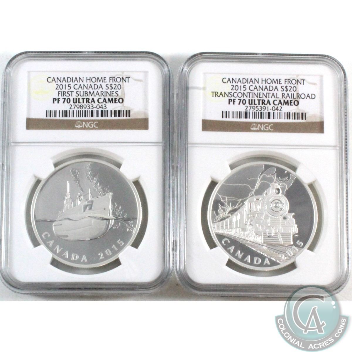 RCM Lot: 2x 2015 Canada $20 Canadian Home front Series Fine Silver Coins NGC Certified PF-70 Ultra Cameo. This lot includes the 2015 Canada $20 First Submarines and the 2015 Canada $20 Transcontinental Railroad (TAX Exempt) (2pcs)