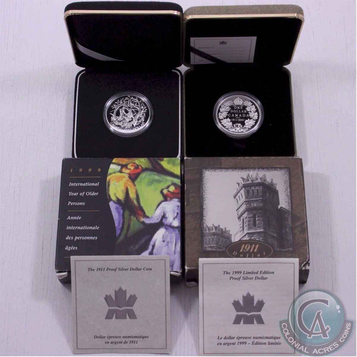 RCM Lot: 2x Canada Proof Silver Dollars. You will receive 1999 International Year of the Older Persons Proof Silver Dollar & 1911-2001 Proof Commemorative Sterling Silver Dollar. Each coins comes with all the original display (outer cardboard sleeves lightly worn)