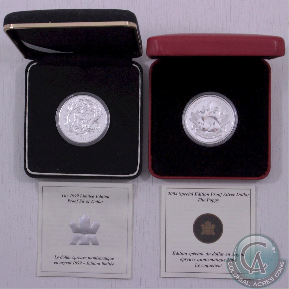 RCM Lot: 2x Commemorative Special Edition Proof Silver Dollar Coins. You will receive the 1999 International Year of the Older Persons and the 2004 Poppy. Both coins come encapsulated in a red clamshell display case with COAs. 2pcs (TAX Exempt)