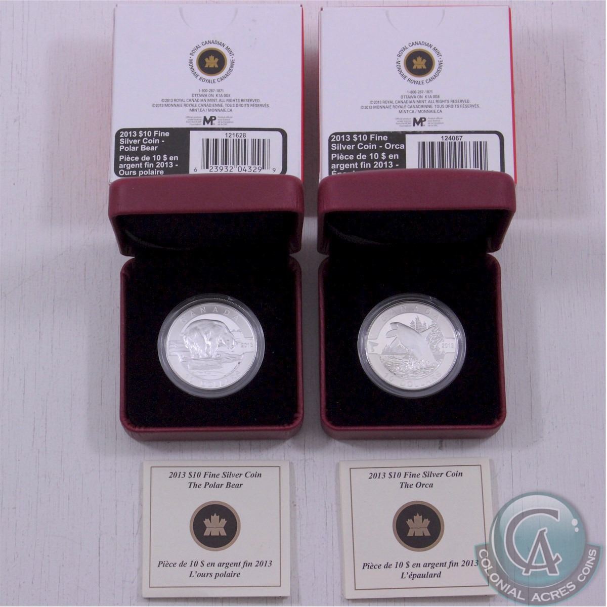 RCM Lot: 2x Fine Silver Coins from the 2013 Canada $10 O Canada Series. This lot contains the $10 Polar Bear (#4) and the $10 Orca (#10) Fine Silver Coins (TAX Exempt) 2 pcs