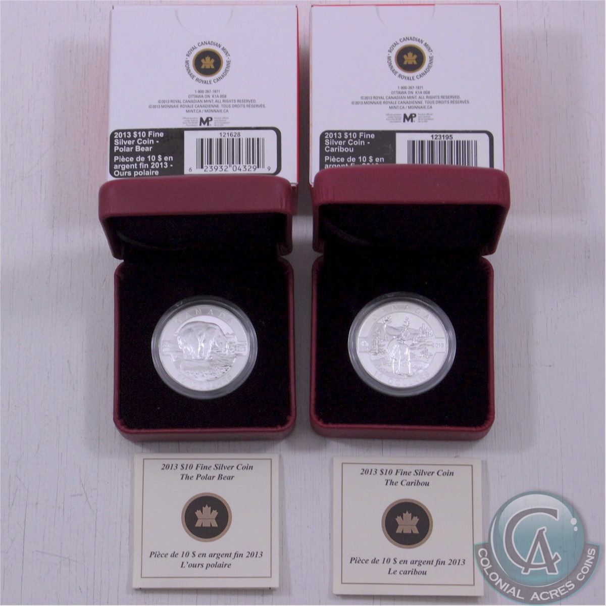RCM Lot: 2x Fine Silver Coins from the 2013 Canada $10 O Canada Series. This lot includes the $10 Polar Bear (#4) and the $10 Caribou (#8) Fine Silver Coins (TAX Exempt). 2pcs