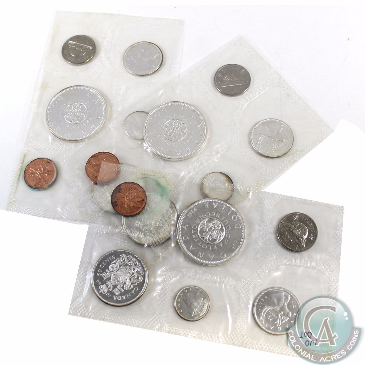 RCM Lot: 3x 1964 Canada "No Dot" Uncirculated Proof Like Sets. This lot contains three 1964 sets of the "No Dot" variety. Please note that the coins are toned and/or the penny contains corrosion. Envelopes are not included. 3pcs