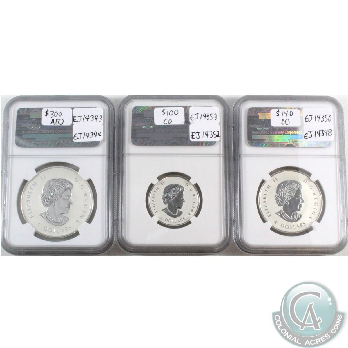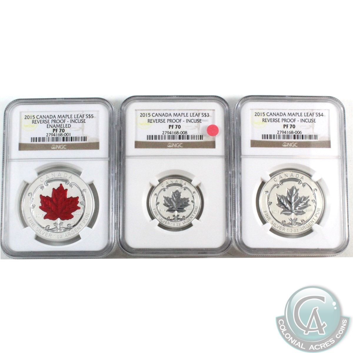 This lot includes the 2015 Incuse $3 Maple Leaf Reverse Proof, 2015 Incuse $4 Reverse Proof and the 2015 Enameled $5 Reverse Proof Maple Leaf.