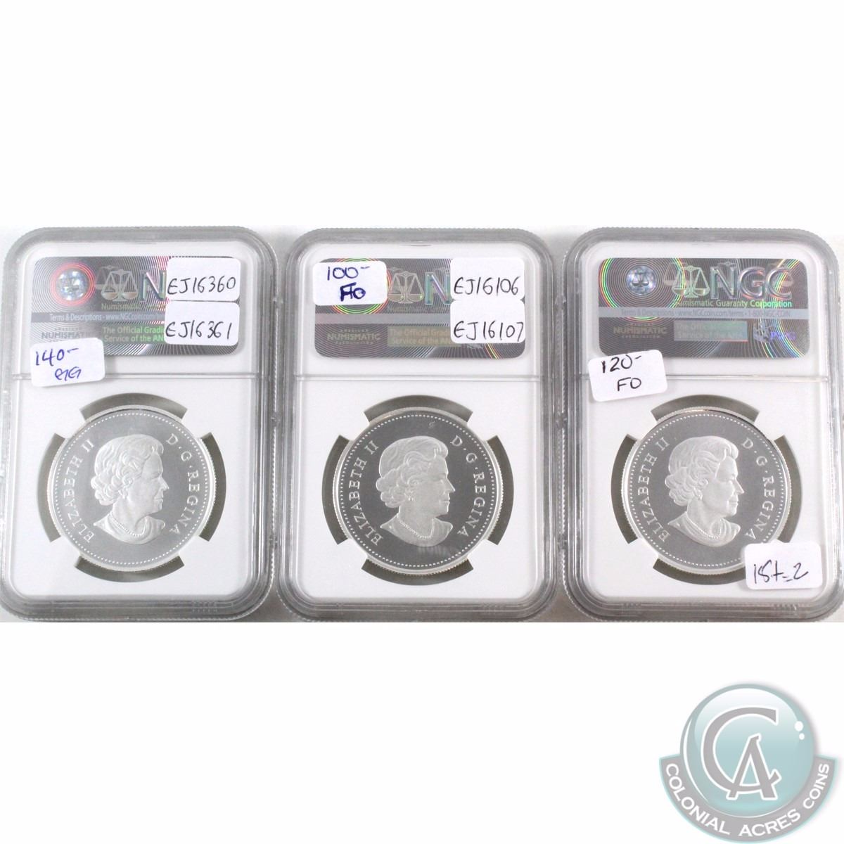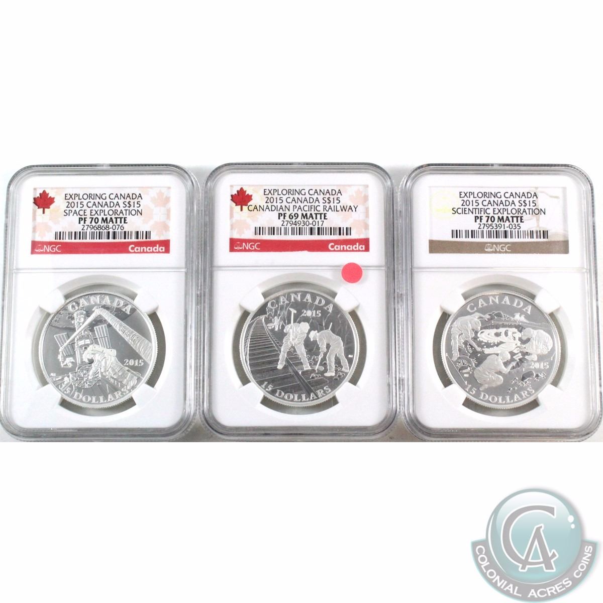 RCM Lot: 3x 2015 Exploring Canada $15 Fine Silver Coins ALL NGC Certified PF-70 Matte. This lot includes the: 2015 Space Exploration, 2015 Scientific Exploration and the 2015 Canadian Pacific Railway (TAX Exempt) (3pcs)