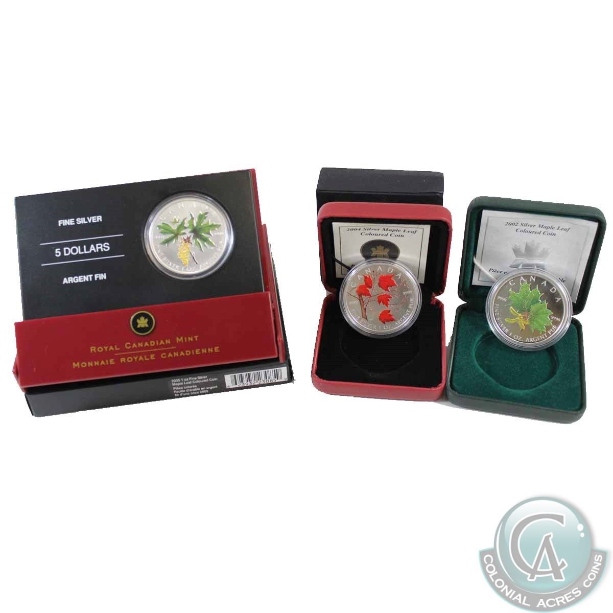 RCM Lot: 3x Canada $5 Coloured Fine Silver Maple Leafs. You will receive 2002, 2004 & 2005 (coins are lightly toned & 2002 has no sleeve). 3pcs (TAX Exempt)