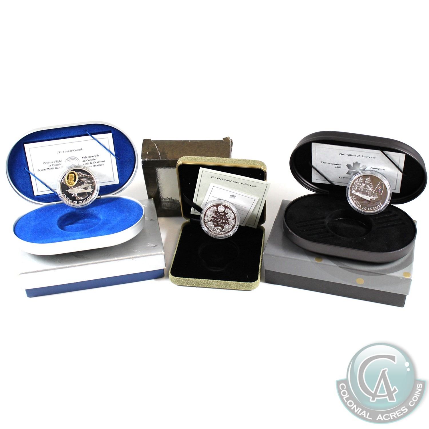 RCM Lot: 3x Canada Fine Silver coins: 1911-2001 Proof Sterling Silver Dollar (worn outer box and capsule contains light scratches), 1995 Canada $20 Aviation - Fleet 80 Canuck Sterling Silver Coin (scuffed capsule & outer box is torn) & 2002 Transportation Series $20 Fine Silver - William D Lawrence Ship (coin is lightly toned & the capsuled is scratched). All coins comes in original Mint packaging.
