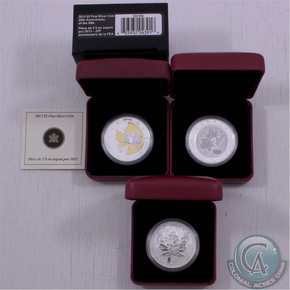 RCM Lot: 3x Canada Silver Maple Leafs. Included are the 2005 D-day Privy SML, 2003 Good Fortune SML, and the 2013 $5 Gold Plated 25th Anniversary SML (TAX Exempt). Each Coin comes encapsulated with display box. (3pcs)