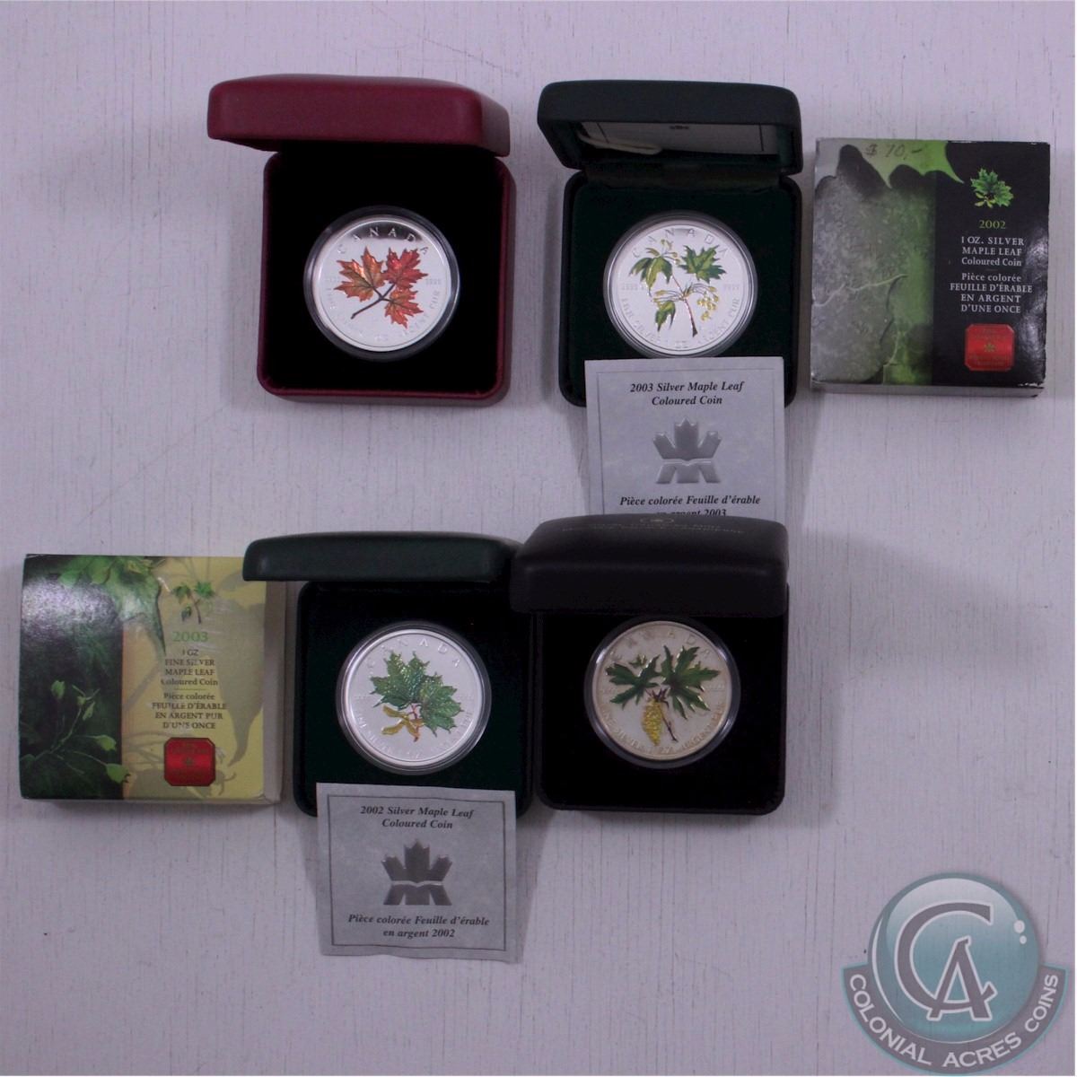 RCM Lot: 4x 2001, 2002, 2003, and 2005 Canada $5 Coloured Silver Maple Leaf coins (TAX Exempt). Coin