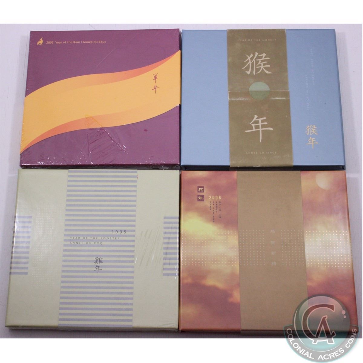 RCM Lot: 4x 2003-2006 Canada $15 Fine Silver Lunar Coin and Stamp Sets. This lot includes the 2003 Year of the Sheep/Goat, 2004 Year of the Monkey, 2005 Year of the Rooster and the 2006 Year of the Dog. Each Coin comes with all original mint packaging. 4pcs