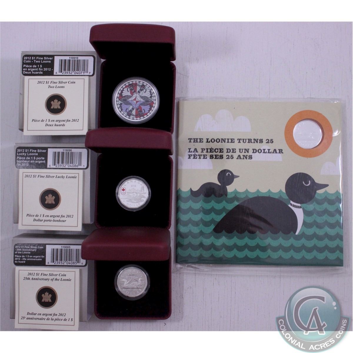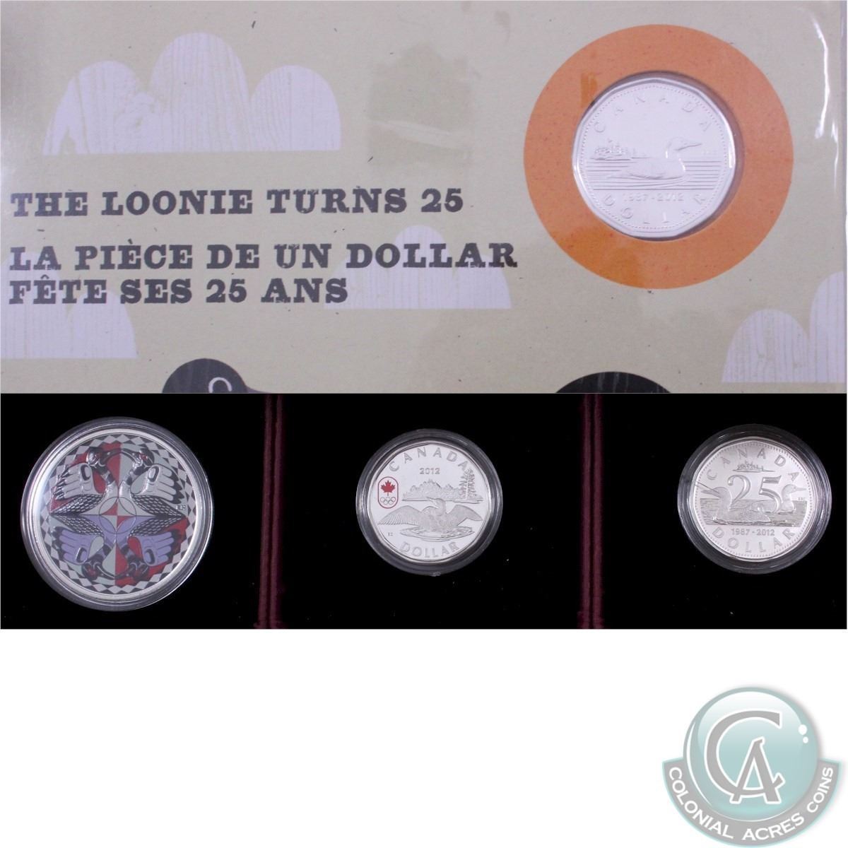 RCM Lot: 4x 2012 Canada 25th Anniversary of the Loonie (1987-2012) RCM issued coins. This lot includes: 2012 $1.00 Silver 11-Sided Loon, 2012 $1.00 Silver Lucky Loonie, 2012 $1.00 Silver Artistic Two Loons and the 2012 25th Anniversary of the Loonie Coin Card including Silver Plated (Double Dated) Loonie (TAX Exempt). 4 pcs.